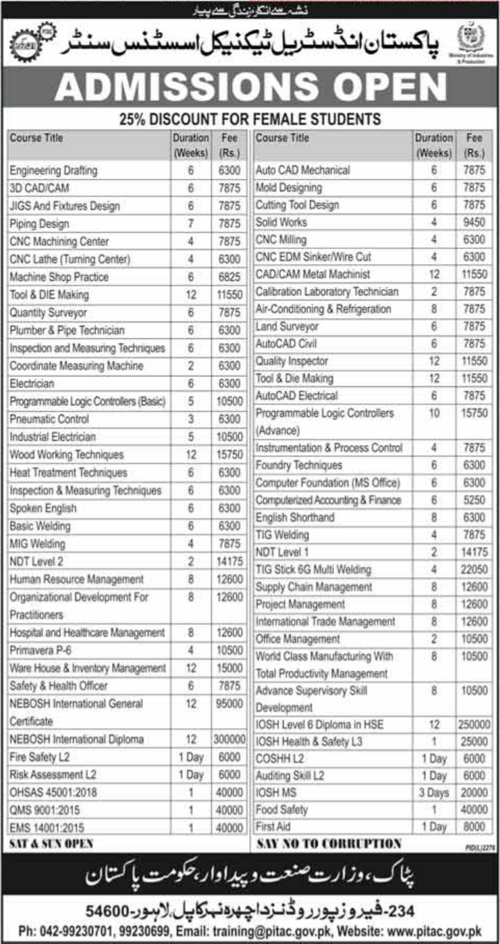 Pakistan Industrial Technical Assistance Center announced the Admission for the session of 2020. The Pakistan Industrial Technical Assistance Center has now starts the Admission in the Engineering Drafting, 3D CAD/CAM, JIGS and Fixtures Design, Piping Design, CNC Machining Center.