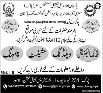 Pakistan Industrial Technical Assistance Center has offering the new admission for Diploma in Building Electrician, Welding, Machinist, Plumbing in Lahore. College also gives the NAVTTC Certificate to the enrolled Students.