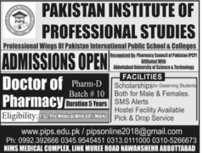 Pakistan Institute of Professional Studies is seeking applications for admissions 2020 in Doctor of Pharmacy Pharm-D 5 years degree program in Abbottabad.
