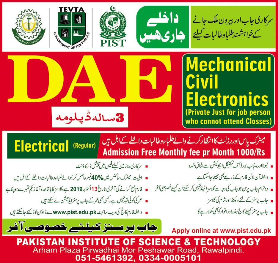 Pakistan Institute of of Science & Technology Rawalpindi has offered admissions for Diploma of Associate Engineer 3 year Duration in Mechanical Engineering, Civil Engineering, Electronics Engineering. Affiliated with Punjab Board of Technical Education. Special discount for Govt.Employers. Last date for submission of admission applications is 13 Oct 2019.