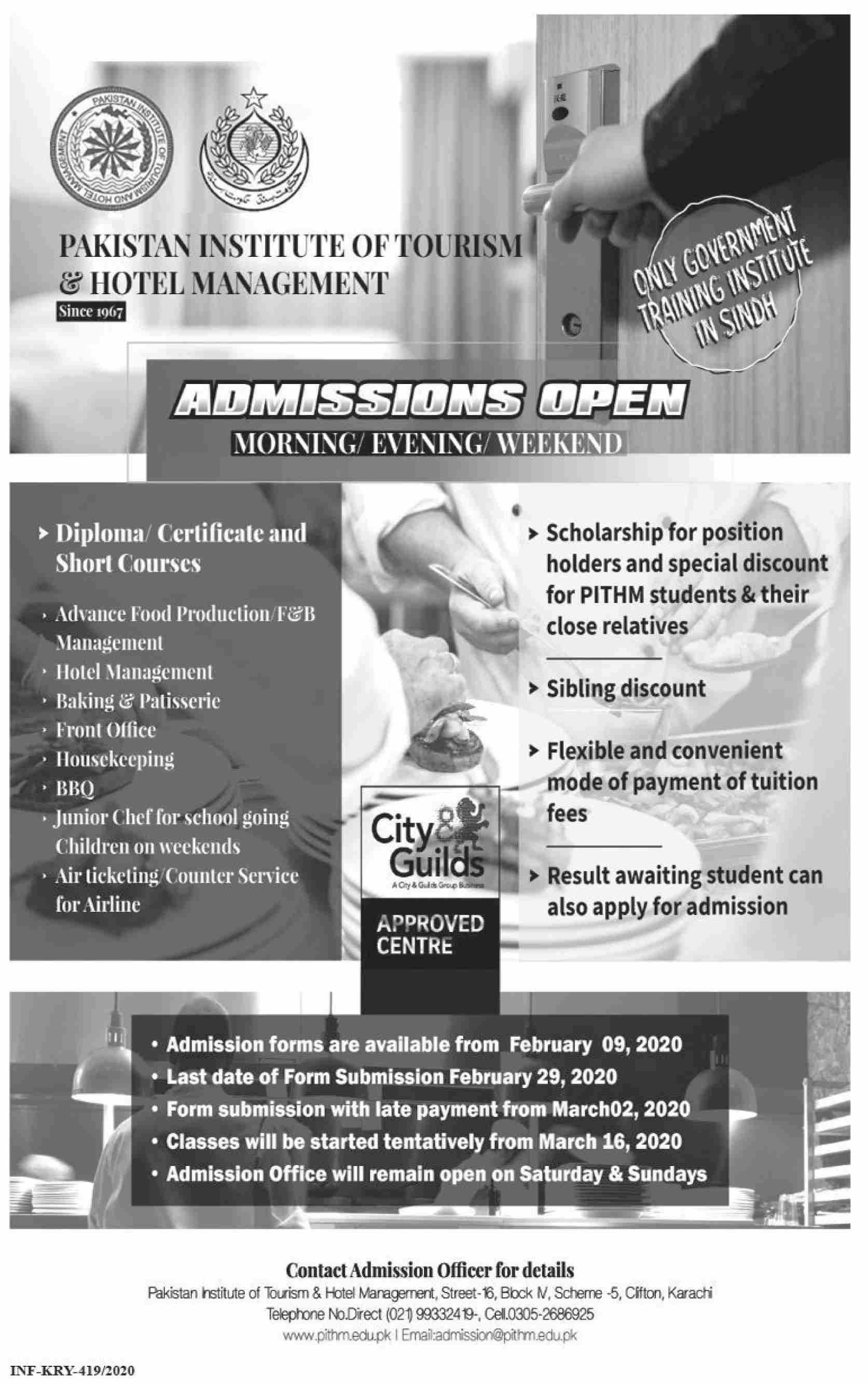 Pakistan Institute of Tourism & Hotel Management announced the Admission for the session of 2020. The Pakistan Institute of Tourism & Hotel Management has now starts the Admission in the Diploma/Certificate and Short Courses.The last date of submission of form is 29th February, 2020.