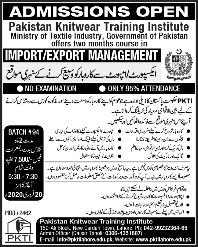 Pakistan Knitwear Training Institute Admission 2020 announced for the Course in Import Export Management. The Students can get their Admission form from Pakistan Knitwear Training Institute. The Classes will starts from 20th February, 2020.