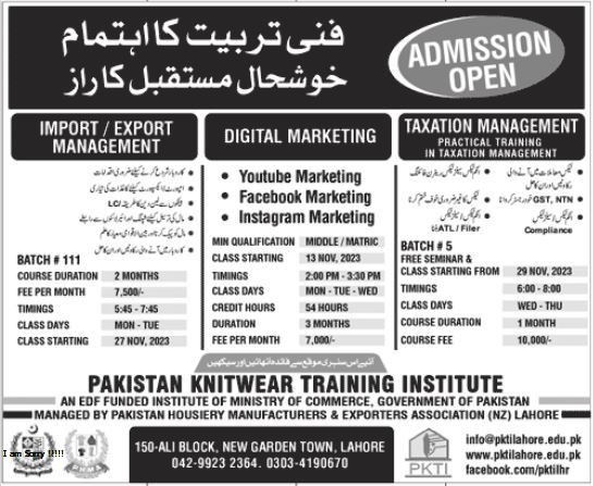 At PAKISTAN KNITWEAR TRAINING INSTITUTE, students have the chance to leverage practical skills and knowledge in international trade, digital marketing, and taxation management. With affordable monthly fees and a commitment to skill enhancement, this institution paves the way for a successful career in the competitive world of commerce. Admission is now open, so seize the opportunity to excel in your field and tap into the potential of a thriving career