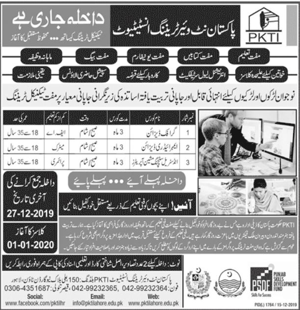 Pakistan Knitwear Training Institute Lahore has announced admissions for Free Technical Training Courses in Graphic Design, Embroidery Design, Industrial Stitching Machine Operator. Free Bags, Uniform, Books and also stipend will be given. Last date for submission of admission applications is 27 Dec 2019.