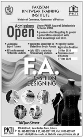 Pakistan Knitwear Training Institute PKTI Ministry of Commerce, Government of Pakistan has offering the admission for FA with Fashion Designing in Lahore. Eligibility criteria is Candidate must be passed Matric.