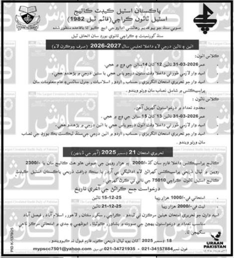 Pakistan Steel Cadet College, Steel Town, Karachi, a well-established educational institution since 1982, affiliated with the Sindh Government and Karachi Board of Secondary Education, is now accepting applications for admission to Class 7 Junior and Class 9 Secondary for the academic session 2026-2027.