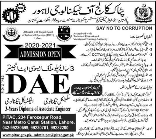 Pataak College of Technology Lahore has offering the admissions for Diploma of associate Engineer in Mechanical Technology, Electrical Technology. The college is affiliated from PBTE. College also providing Scholarships.