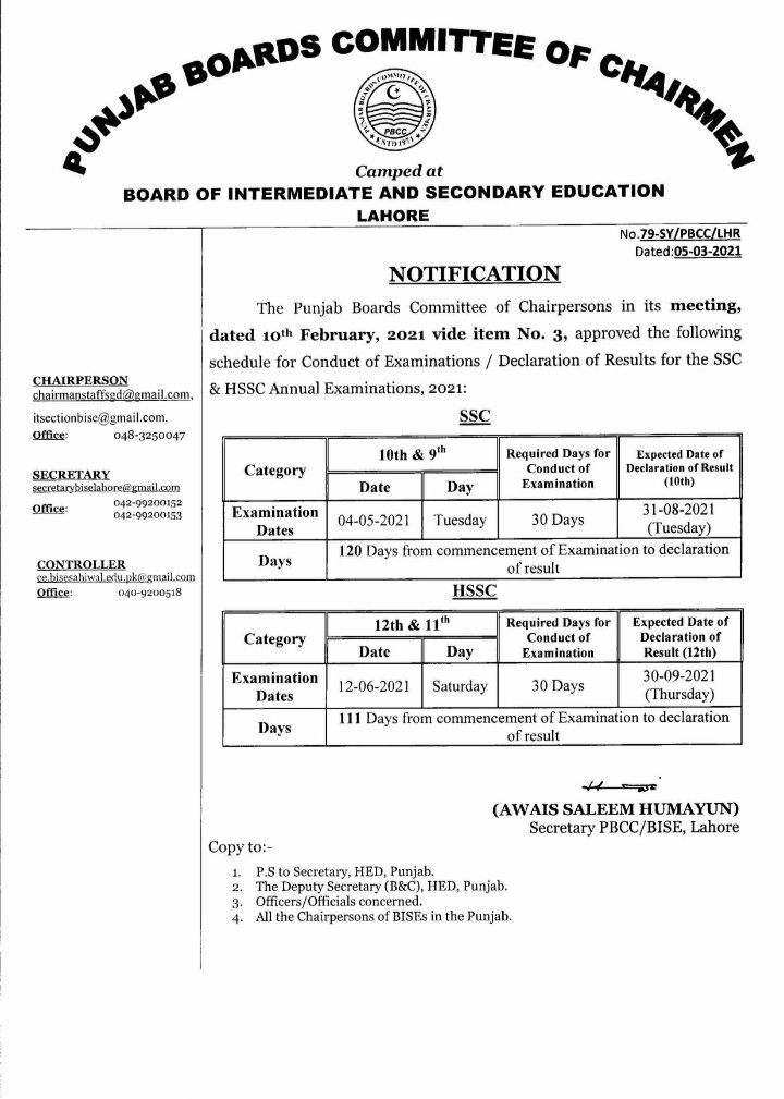 PBCC Matric Part I & II Annual Exams 2021 Result Schedule