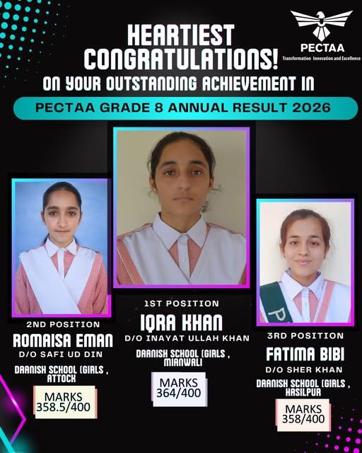 The Punjab Education and Cultural Toppers Academic Association recently declared the PECTAA Grade 8 Annual Result 2026 during a formal ceremony in April 2026. Students from Daanish Schools dominated the top positions, with Iqra Khan of Mianwali securing the first position across the province. This official announcement marks a critical academic milestone for thousands of middle school students seeking admission into competitive secondary institutions.