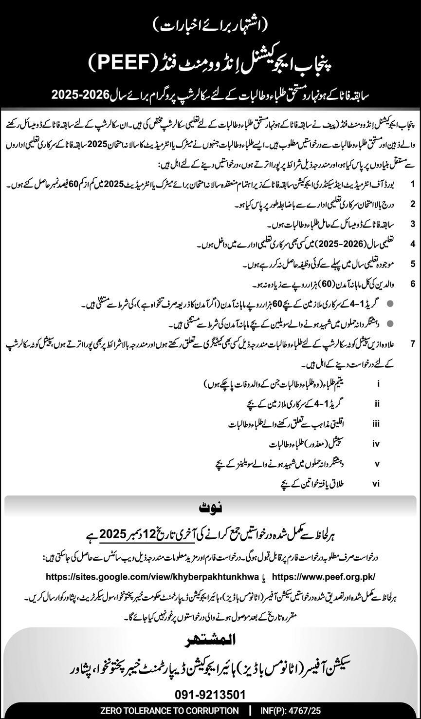 The Punjab Educational Endowment Fund PEEF announces special educational scholarships for talented and deserving students belonging to the former FATA region. Applications are invited from students who hold a domicile of the former FATA and meet the prescribed eligibility criteria.
