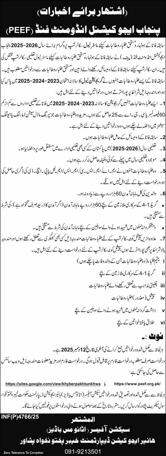 The Punjab Educational Endowment Fund PEEF invites applications for the Master’s Level Scholarship Program for the academic session 2025–2026, specifically allocated for brilliant and deserving students belonging to the former FATA region. Students who hold a domicile of former FATA and meet the following eligibility criteria are encouraged to apply.