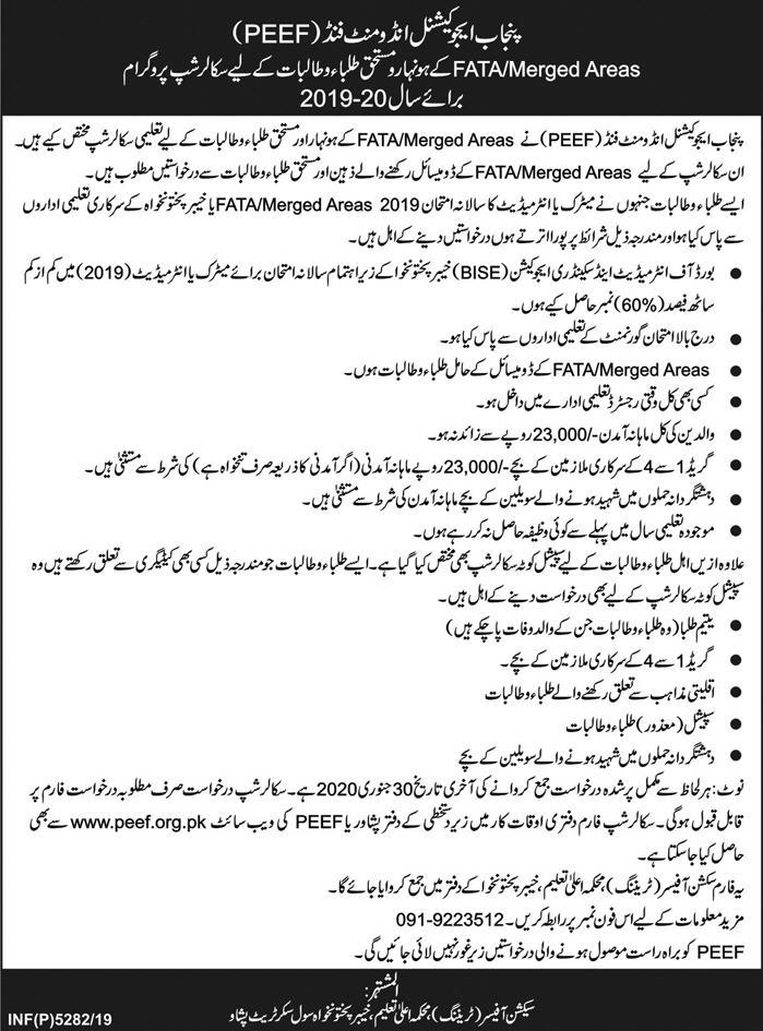 Punjab Education Endowment Fund PEEF has announces scholarships for talented and deserving students of FATA/Merged areas for session 2019-20. Students are eligible who have passed matric and inter exams. Last date for form submission for PEEF KP Scholarships is January 30, 2020. Only having domicile of FATA/Merged areas can apply.