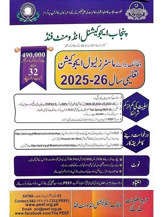The government of the Punjab is going to start their Punjab Educational Endowment Fund for grant of scholarships for the masters level education for the academic year 2025-26. The government has fixed the amount of 32 billions rupees for the grant of 4,90,000 scholarships to the students on the merit basis and to the deserving students on the need basis. The students can get the latest updates of PEEF Masters Level Education Scholarships 2025-26.