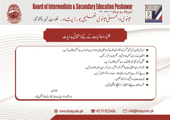 Board of Intermediate and Secondary Education Peshawar has shared a fresh set of important guidelines for students appearing in the examinations. All candidates are advised to strictly observe these instructions to ensure an orderly and transparent examination environment. The students can get the latest information of Peshawar Board Announces Essential Instructions for Exams Candidates.