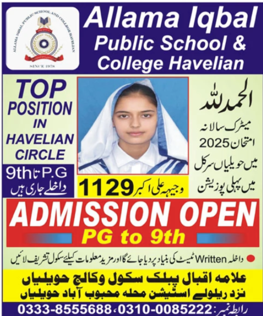 Allama Iqbal Public School & College, Havelian, a prestigious educational institution established in 1978, is proud to announce that admissions 2026 for the new academic session 2026 are now open. With decades of experience in delivering quality education, the school has built a strong reputation for academic excellence, discipline, and overall student development.