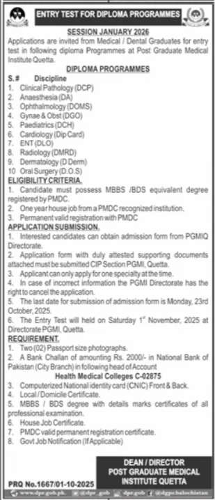 The Post Graduate Medical Institute PGMI Quetta invites applications for admissions 2025 from eligible Medical and Dental graduates for the Entry Test for the following Postgraduate Diploma Programmes commencing in January 2026.