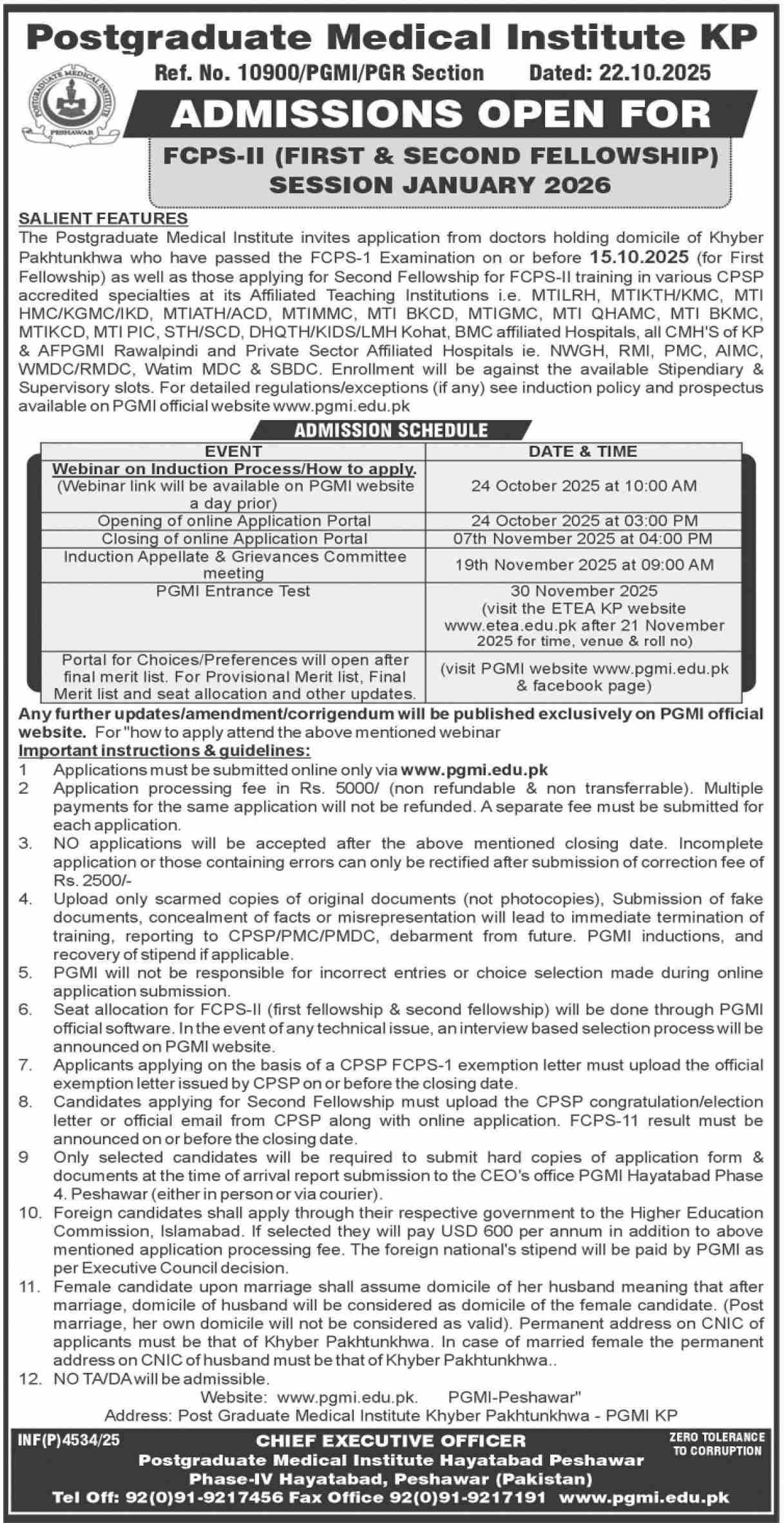 The Postgraduate Medical Institute PGMI, Khyber Pakhtunkhwa, invites online applications from doctors holding domicile of Khyber Pakhtunkhwa for admission in FCPS-II First and Second Fellowship training programs for the January 2026 session.