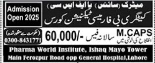 Pharma World Institute, Lahore, proudly announces that admissions are now open for the Pharmacy Technician Category-B Course Session 2025. This opportunity is ideal for students who have completed their Matric Science or F.Sc Pre-Medical and wish to build a career in the pharmaceutical and healthcare industry.