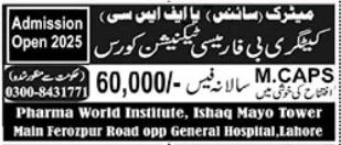 Pharma World Institute , a government-recognized institute located in Lahore, is now accepting applications for the Pharmacy Technician Category-B Course for the year 2025. Students who have completed Matric Science or FSc Pre-Medical are eligible to apply and take advantage of this career-building opportunity.