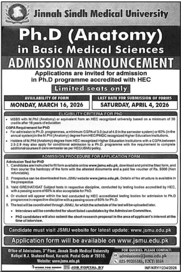 Jinnah Sindh Medical University JSMU is inviting applications for its Ph.D program in Anatomy under the Faculty of Basic Medical Sciences. This highly specialized doctoral program is accredited by the Higher Education Commission HEC and offers a limited number of seats, providing candidates with advanced research opportunities in anatomy and related medical sciences.