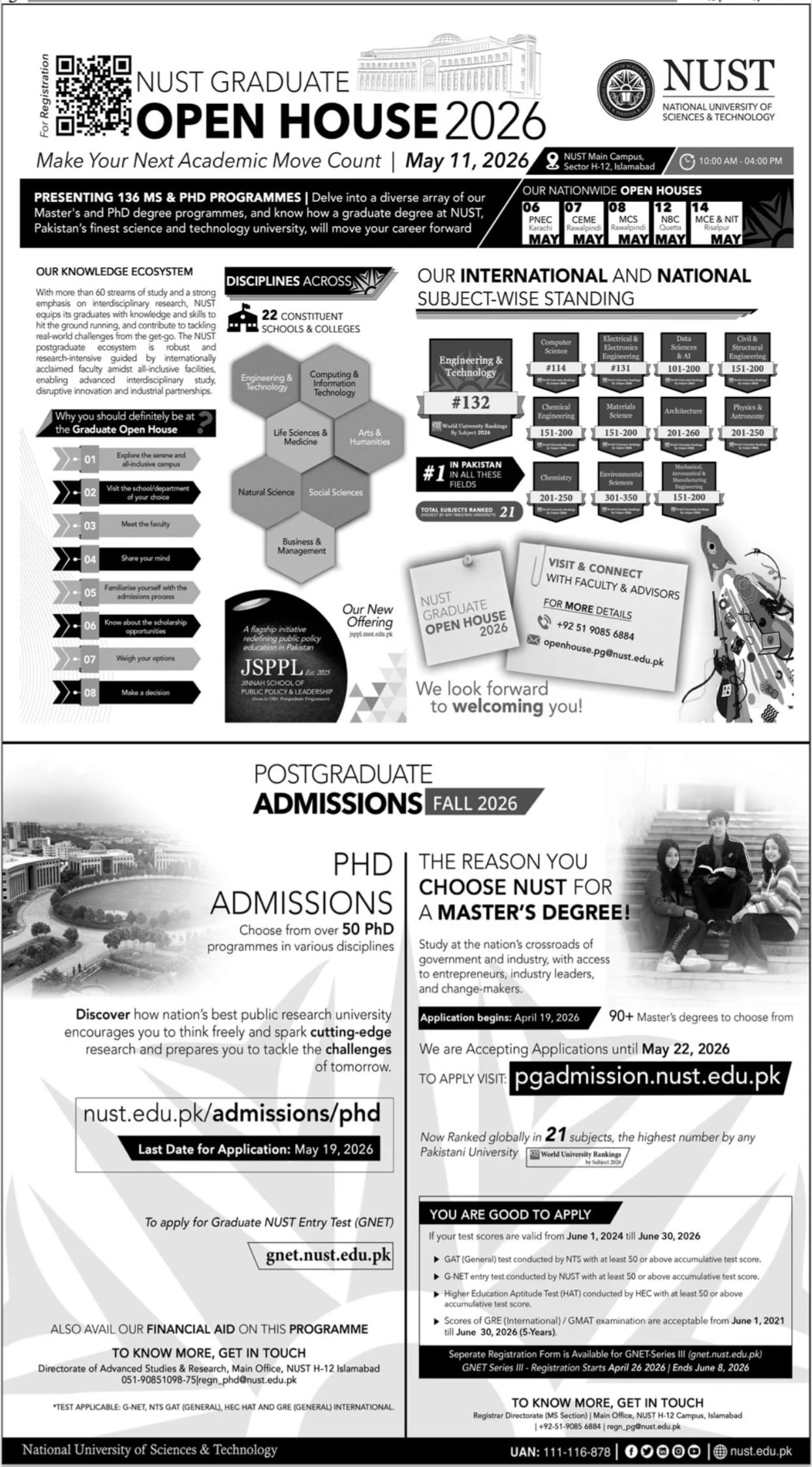 National University of Sciences & Technology has announced its Graduate Open House 2026, inviting prospective students to explore Master’s MS and PhD programmes across a wide range of disciplines. The event is designed to help students understand academic pathways, research opportunities, and admission procedures at Pakistan’s leading science and technology university.