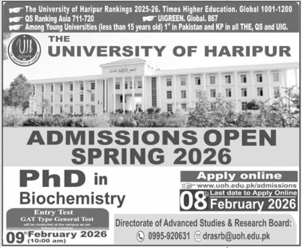 The University of Haripur has officially announced the commencement of its Spring 2026 academic cycle. As a rapidly ascending institution in the higher education sector, the university is inviting applications for its prestigious PhD in Biochemistry program. This announcement comes at a time when the institution is celebrating significant global recognition, being ranked 1st in Pakistan among Young Universities less than 15 years old according to THE, QS, and UIG rankings.