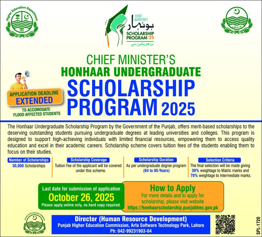 The Government of Punjab proudly announces the Chief Minister Honhaar Undergraduate Scholarship Program 2025, aimed at supporting talented and financially deserving students pursuing undergraduate degrees at top universities and colleges across Punjab.