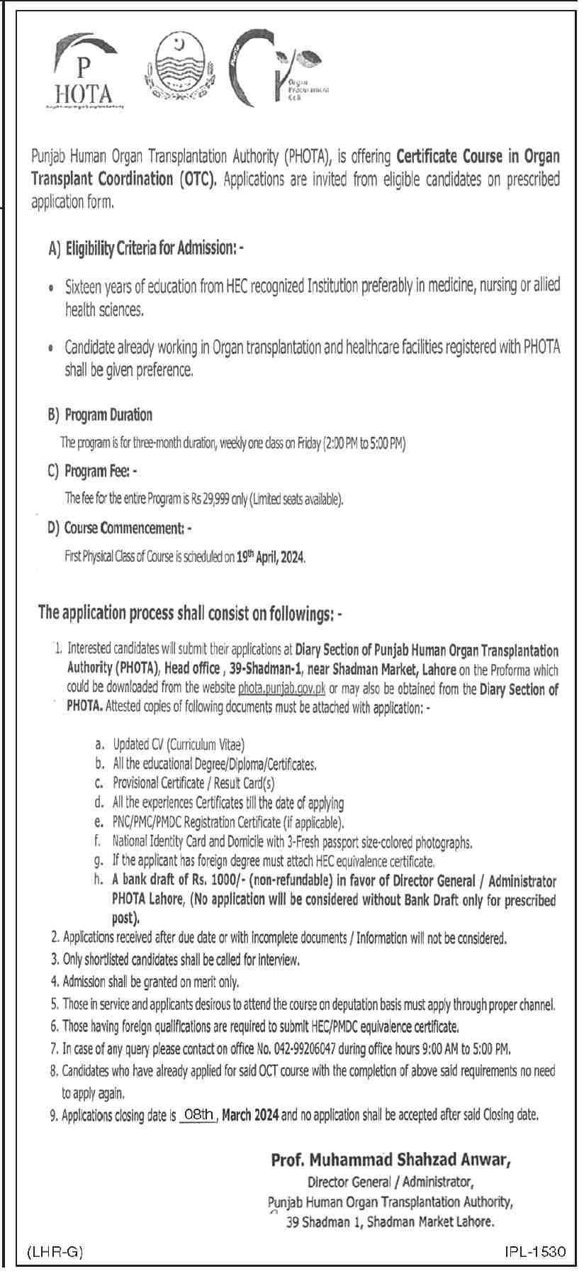 Punjab Human Organ Transplantation Authority PHOTA Offers Certificate Course in Organ Transplant Coordination OTC open admission 2024