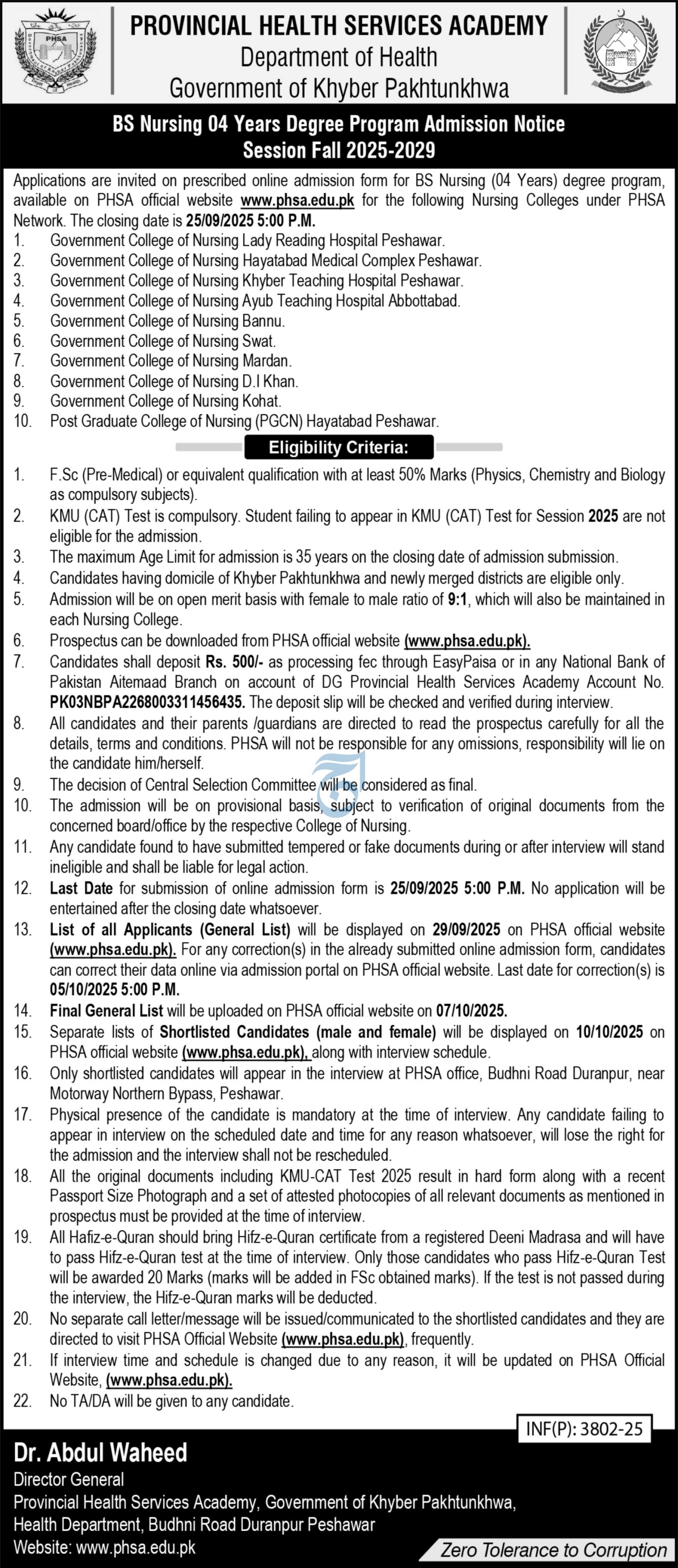 The Provincial Health Services Academy PHSA, under the Health Department, Government of Khyber Pakhtunkhwa, invites online applications for admission to the BS Nursing 4-Year Degree Program for the session Fall 2025–2029. Applicants must apply through the official PHSA website.