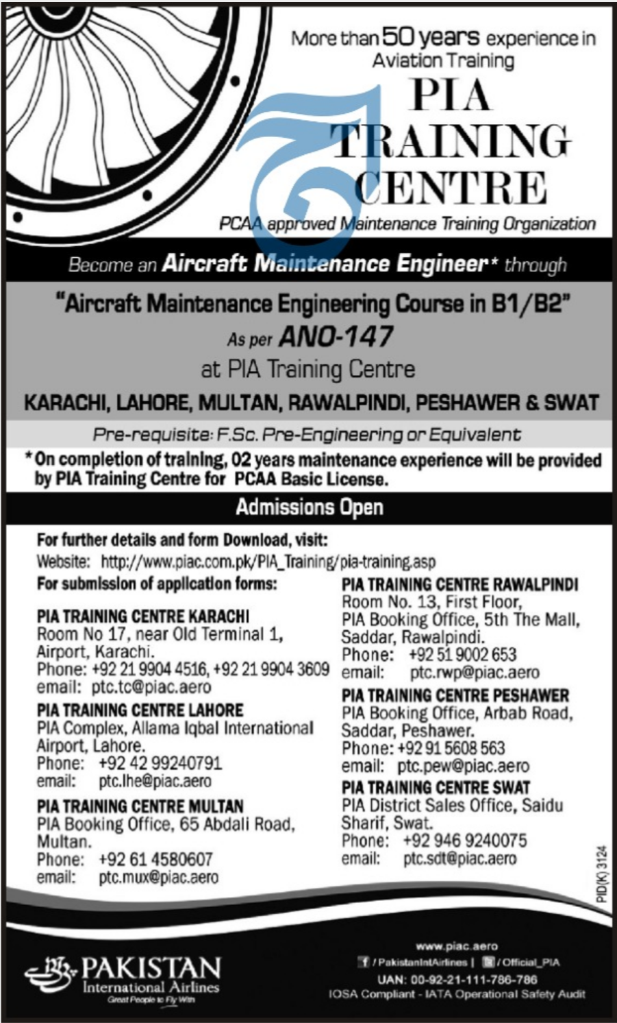 PIA Training Centre Admission 2020 announced for the course in the Aircraft Maintenance Engineering Course in B1/B2 as per ANO-147. The Students can now get their Application form for the Submission from the PIA Training Centre.
