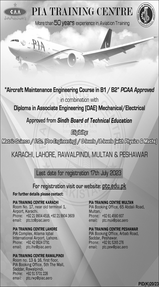 PIA Training Centre is delighted to announce admissions for the year 2023. Aspiring students can now enroll in two exceptional courses: the Aircraft Maintenance Engineering Course and the DAE in Electrical and Mechanical Engineering. These programs offer comprehensive training and hands-on experience, preparing students for rewarding careers in the aviation and engineering industries. Interested candidates are encouraged to apply promptly, as the admission 2023 end date is set for 17 July 2023. Dont miss this opportunity to acquire valuable skills and knowledge under the guidance of experienced instructors. Secure your place at PIA Training Centre and embark on a path to success in these promising fields. Apply today and shape a prosperous future.
