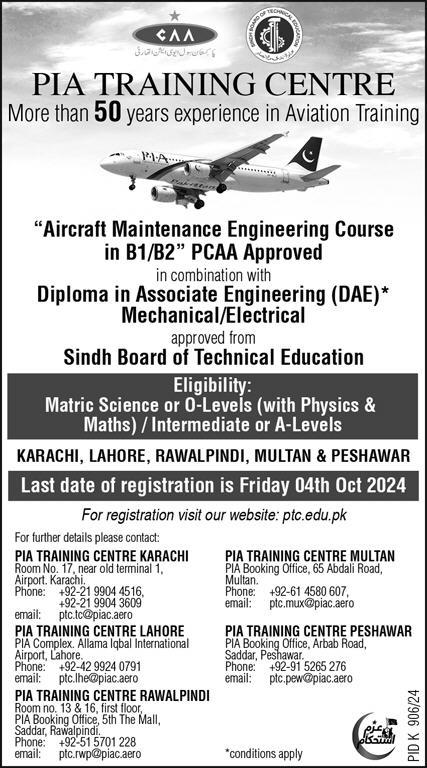 The PIA Training Centre opening admissions for 2024 and has established itself as a leading institution in aviation training, with over 50 years of experience in shaping the careers of aspiring aviation professionals. This prestigious center is now offering the Aircraft Maintenance Engineering Course in B1/B2, approved by the Pakistan Civil Aviation Authority PCAA. This program is designed to equip students with the essential skills and knowledge required for a successful career in aircraft maintenance, complemented by a Diploma in Associate Engineering DAE in Mechanical or Electrical disciplines, accredited by the Sindh Board of Technical Education.