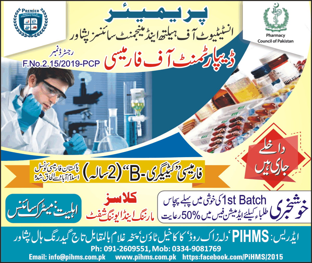 Institute of Health & Management Sciences Department of Pharmacy Peshawar has offered admissions for Pharmacy Category B, 2 years Course. Admissions are open. Morning & Evening Shift Classes. Matric with Science students are eligible to apply.