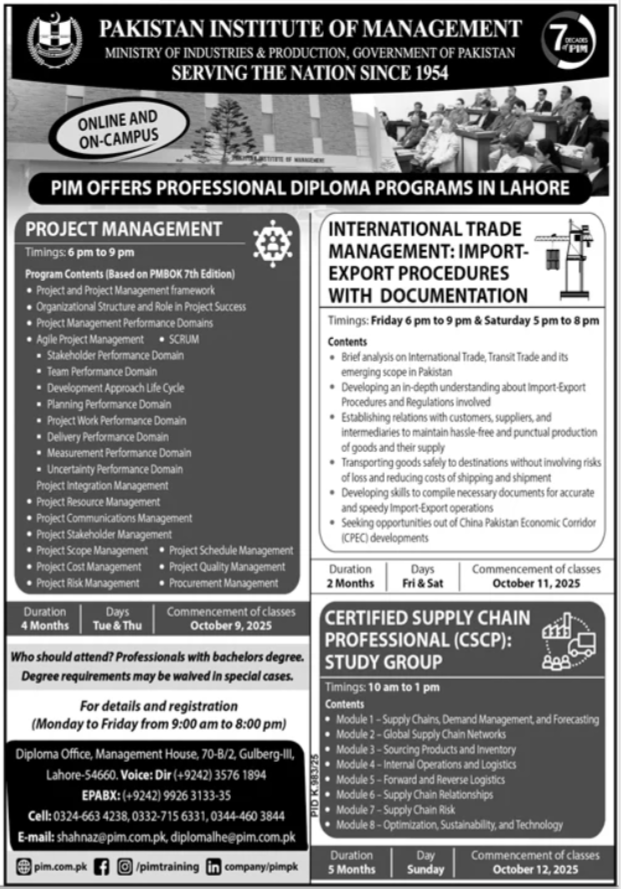 The Pakistan Institute of Management PIM, a pioneer in executive and professional education since 1954, proudly announces Fall 2025 admissions for its career-oriented diploma programs in Lahore. Whether you aim to advance in project management, trade, or supply chain operations, PIM offers flexible learning opportunities with evening and weekend classes—both online and on-campus.