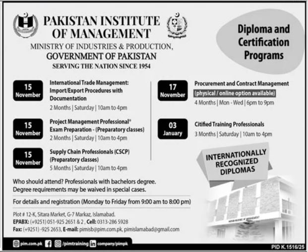 The Pakistan Institute of Management PIM, under the Ministry of Industries & Production, Government of Pakistan, has been serving the nation since 1954 by providing high-quality professional training and internationally recognized certifications. PIM is now accepting applications for its upcoming diploma and certification programs in management and professional development.