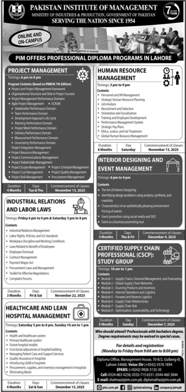 The Pakistan Institute of Management PIM, a premier public-sector training and development organization under the Ministry of Industries & Production, Government of Pakistan, proudly announces admissions to its latest batch of Professional Diploma Programs in Lahore.