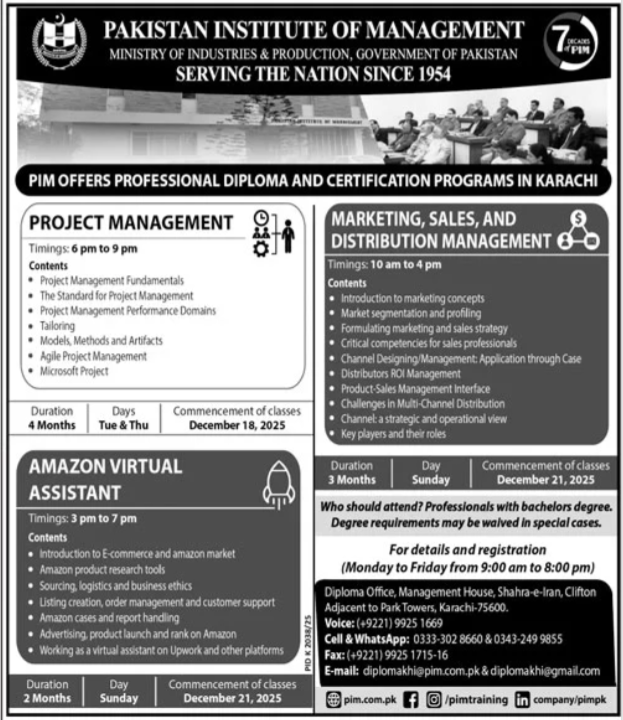 The Pakistan Institute of Management PIM, operating under the Ministry of Industries & Production, Government of Pakistan, has been serving the nation since 1954 by delivering high-quality professional education and management training. PIM is now accepting admissions for its Professional Diploma and Certification Programs offered in Karachi.
