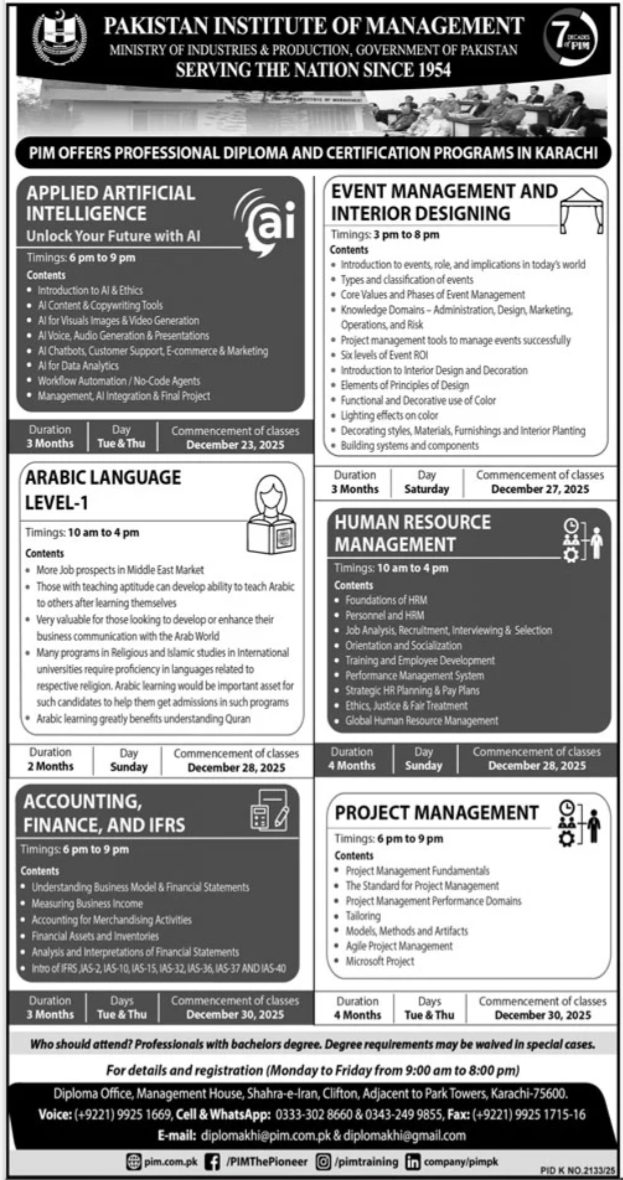 The Pakistan Institute of Management PIM invites applications for its Professional Diploma and Certification Programs in Karachi. With a legacy of excellence spanning over seven decades, PIM continues to empower professionals with practical, industry-relevant skills designed to meet modern organizational and market needs.