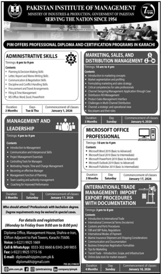 The Pakistan Institute of Management PIM invites applications for its Professional Diploma and Certification Programs starting in January 2026. These industry-oriented programs are designed to enhance managerial, administrative, and professional skills of working individuals and aspiring professionals.