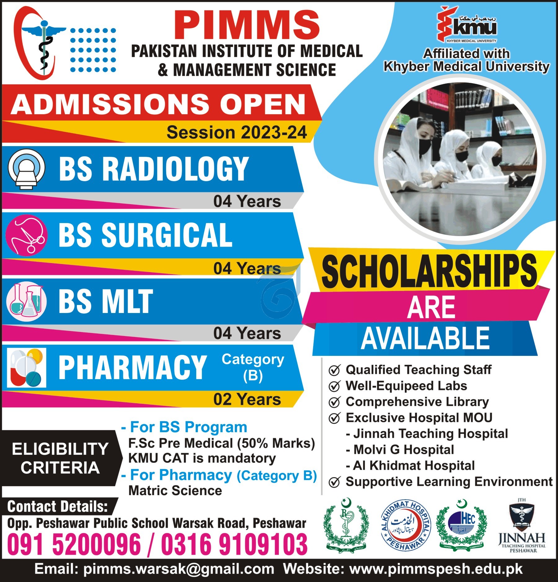 PIMMS, affiliated with Khyber Medical University, presents a unique opportunity for aspiring healthcare and management professionals to embark on their educational journey. With a range of programs, scholarships, and exceptional facilities, PIMMS stands as a strong choice for those looking to pursue a career in these fields. Dont miss this chance to be a part of an institution that prioritizes academic excellence and prepares students for successful careers in healthcare and management. Apply today and take the first step toward a brighter future.