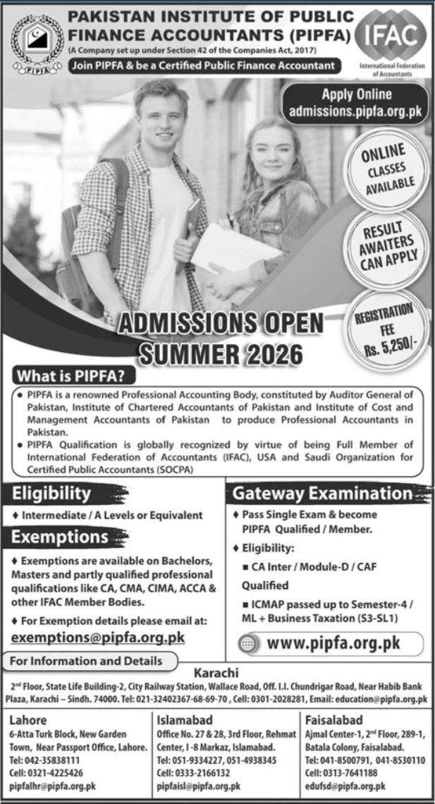 The Pakistan Institute of Public Finance Accountants PIPFA, a professional accounting body established under Section 42 of the Companies Act, 2017, invites aspiring accountants to join PIPFA and become a Certified Public Finance Accountant.
