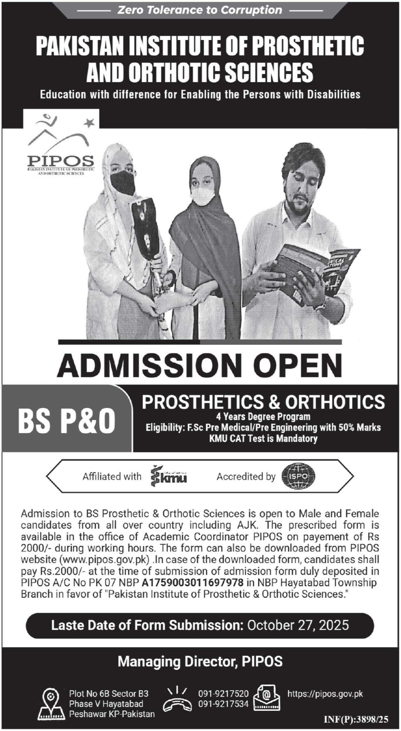 The Pakistan Institute of Prosthetic and Orthotic Sciences PIPOS is pleased to announce that admissions are now open for the Bachelor of Science in Prosthetics and Orthotics BS P&O – a 4-year degree program aimed at empowering future professionals to enhance the lives of persons with disabilities.