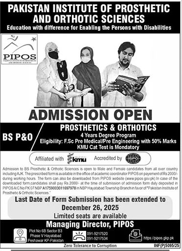 The Pakistan Institute of Prosthetic and Orthotic Sciences PIPOS, a leading institute dedicated to enabling persons with disabilities, has announced admissions for the BS Prosthetics & Orthotics P&O 4-year degree program for the academic session 2025-26. The institute prides itself on delivering “education with difference”, preparing skilled professionals to contribute meaningfully to rehabilitation and allied health services across Pakistan.