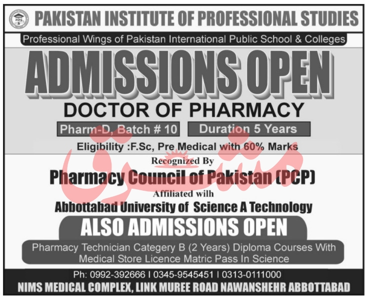 Pakistan Institute of Professional Studies Abbottabad, Recognized by Pharmacy Council of Pakistan PCP, has decided to announce Admissions and offering Applications to Aspirants for AdmissionsAdmissions to Pharm-D Batch-10 duration of 5 Years. Candidates having FSc Pre-Medical education with 60% are eligible to apply. Admissions are open for Session 2021-2022. Admissions will be granted on merit basis. Admissions are open