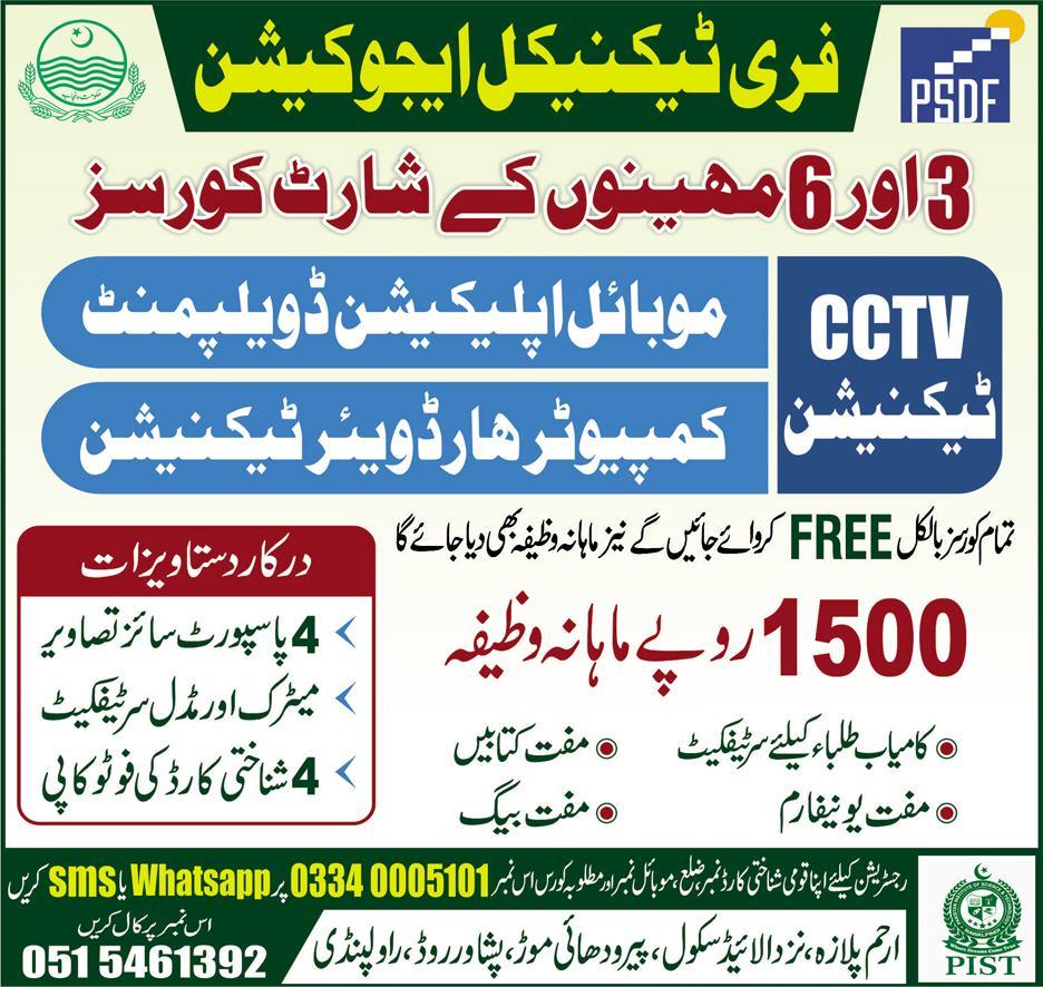 Pakistan Institute of Science & Technology Rawalpindi has announced admissions for Diploma courses in CCTV Technician, Mobile Application Development, Computer Hardware Technician. Scholarship are available.