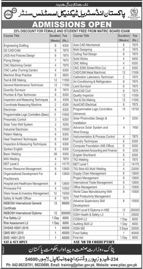 Pakistan Industrial Technical Assistance Center Lahore has announced admissions for Diploma courses in Engineering Drafting, Cutting tool design, Electrician, Piping design, Spoken English, Basic Welding, Computer foundation, English shorthand, Food safety, First Aid.