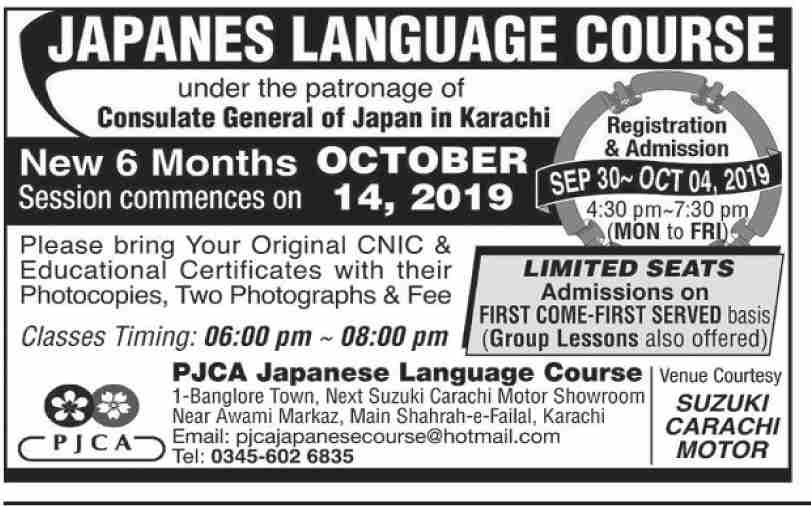 PJCA Japanese Language Course Karachi has announced admissions for 6 Months Japanese Language Course. Last date for submission of admission application is 04 Oct 2019. Session commences on 14 Oct 2019.