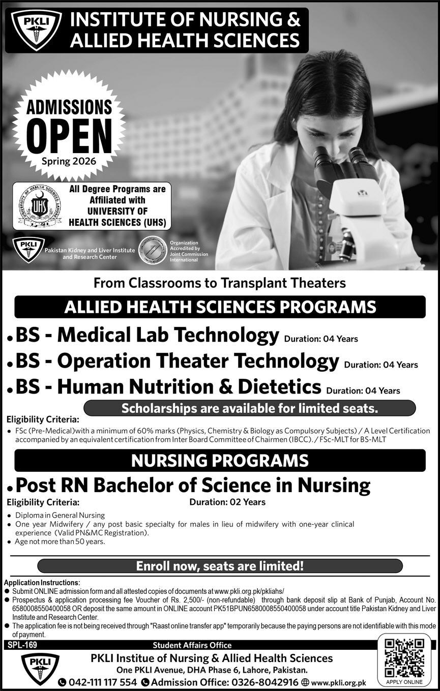 The PKLI Institute of Nursing & Allied Health Sciences PKLI-INAHS has officially invited applications for its Spring PKLI admissions 2026 intake. Affiliated with the University of Health Sciences UHS and backed by the Pakistan Kidney and Liver Institute and Research Center, the institute offers a specialized learning environment that transitions students from classrooms to transplant theaters.