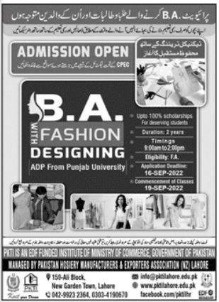 Pakistan Knitwear Training Institute BA Fashion Designing Course Admission 2022 have recently been announced by college administrations. Candidates are encouraged to relate for admissions in their relevant institutes. Students may apply for various admissions, including those offered by PKTI that is BA Fashion Designing Course. The last date to submit an application is 16th of September 2022. Commencement of classes will be started on 19th of September.