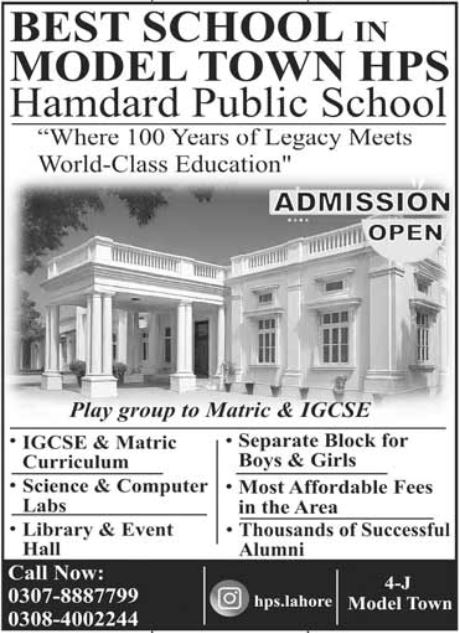 Hamdard Public School, an institution renowned for its "100 Years of Legacy", has officially announced that HPS admissions 2026 are now open for students seeking a blend of tradition and modern world-class education. Located in the heart of Model Town, Lahore, the school continues its mission to provide high-quality learning environments for the next generation.